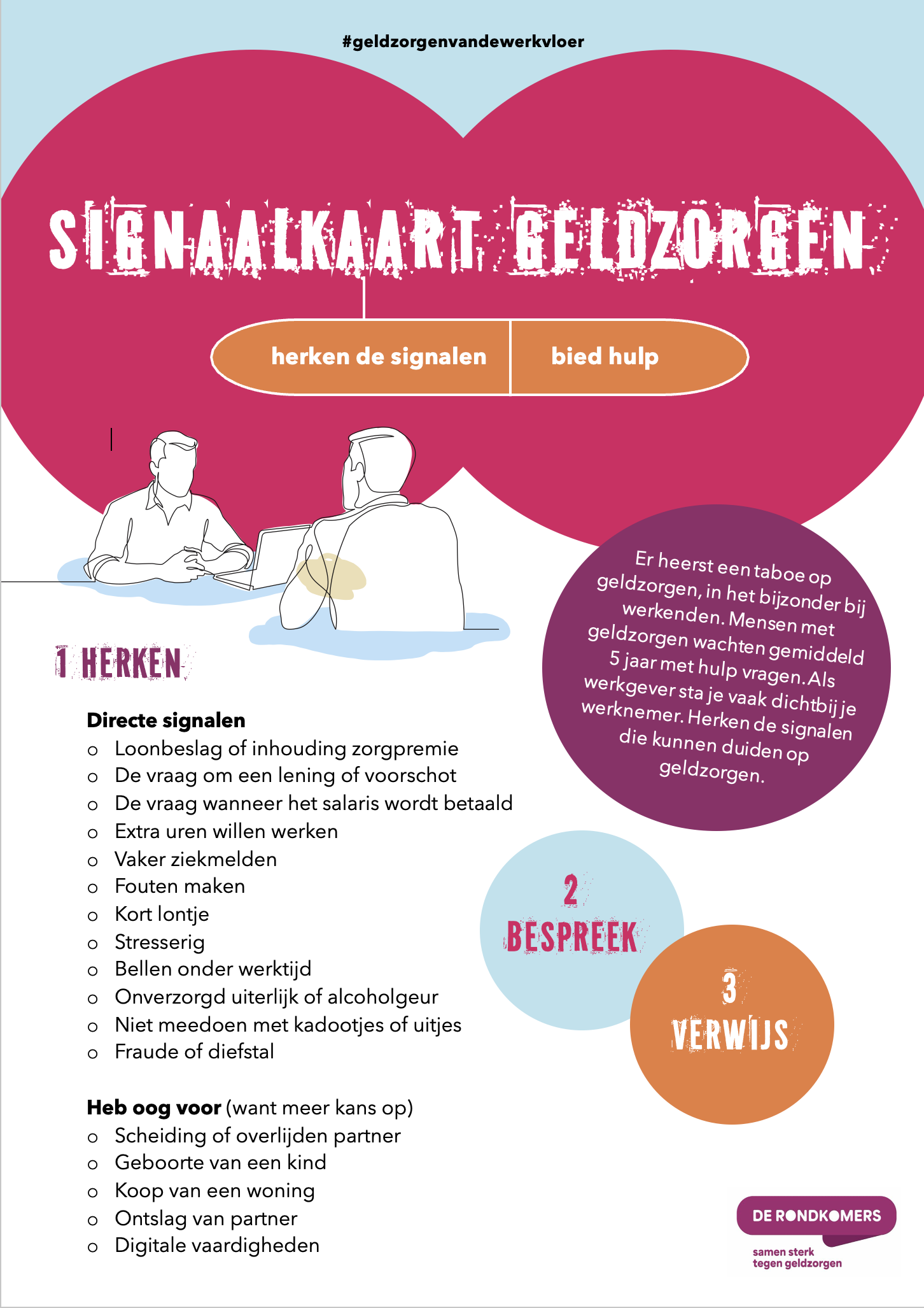 Er heerst een taboe op geldzorgen en al helemaal onder werkenden. Daarnaast wordt het bespreekbaar maken van geldzorgen als lastig ervaren. Hierin kunnen wij een handje helpen. Door leidinggevenden en HR-medewerkers bewust te maken van signalen en hen te leren hoe hoe het gesprek hierover te voeren. Maar ook door een interne campagne op te zetten met de boodschap: geldzorgen, het kan iedereen overkomen.