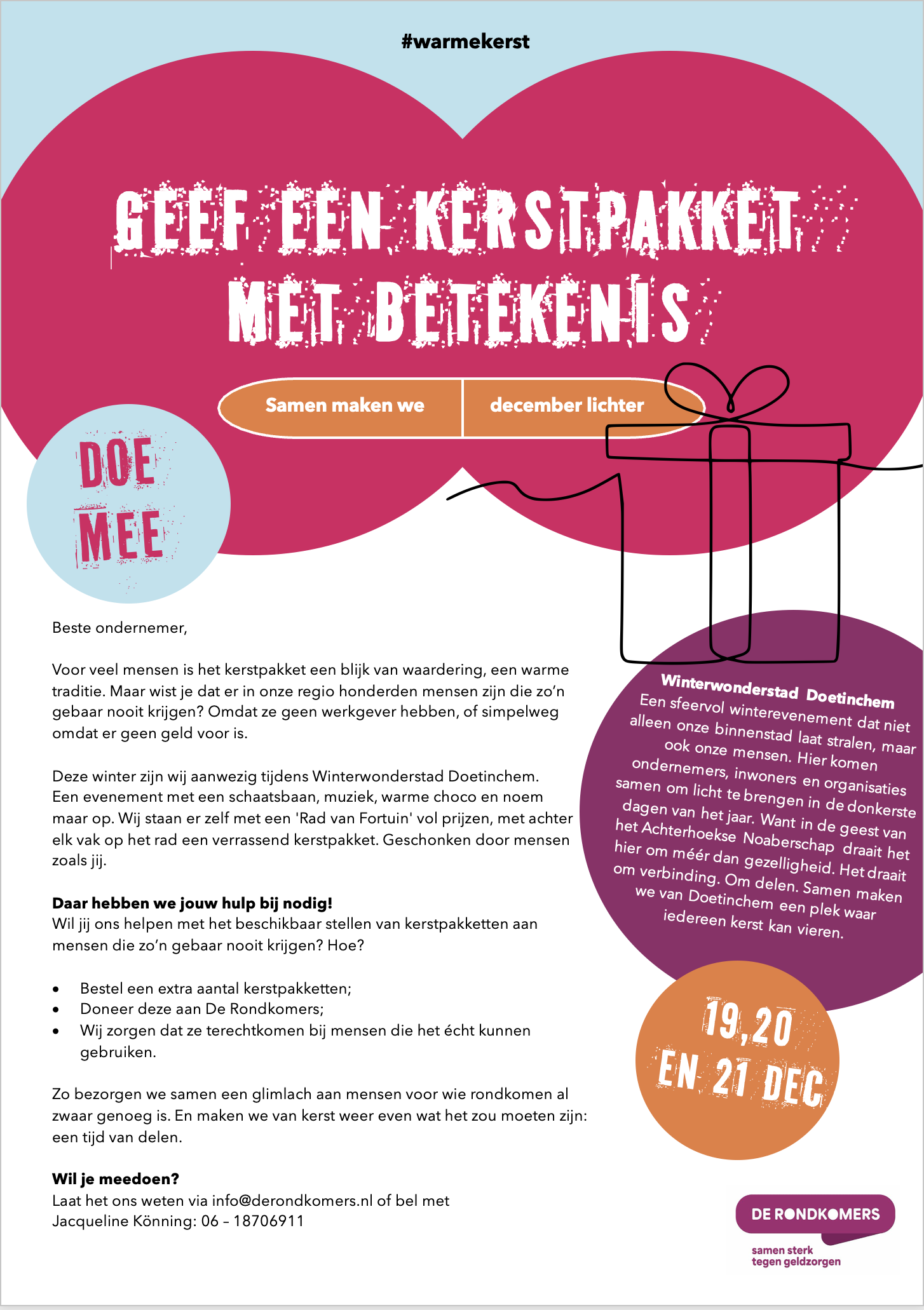 Voor veel mensen is het kerstpakket een blijk van waardering, een warme traditie. Maar wist je dat er in onze regio honderden mensen zijn die zo’n gebaar nooit krijgen? Omdat ze geen werkgever hebben, of simpelweg omdat er geen geld voor is. Tijdens Winterwonderstad staan wij met zelf met een ‘Rad van Fortuin’ vol prijzen, met achter elk vak op het rad een verrassend kerstpakket. Geschonken door werkgevers. Zo bezorgen we samen een glimlach aan mensen voor wie rondkomen al zwaar genoeg is. En maken we van kerst weer even wat het zou moeten zijn: een tijd van delen. Lees hier hoe je een kerstpakket kunt schenken.